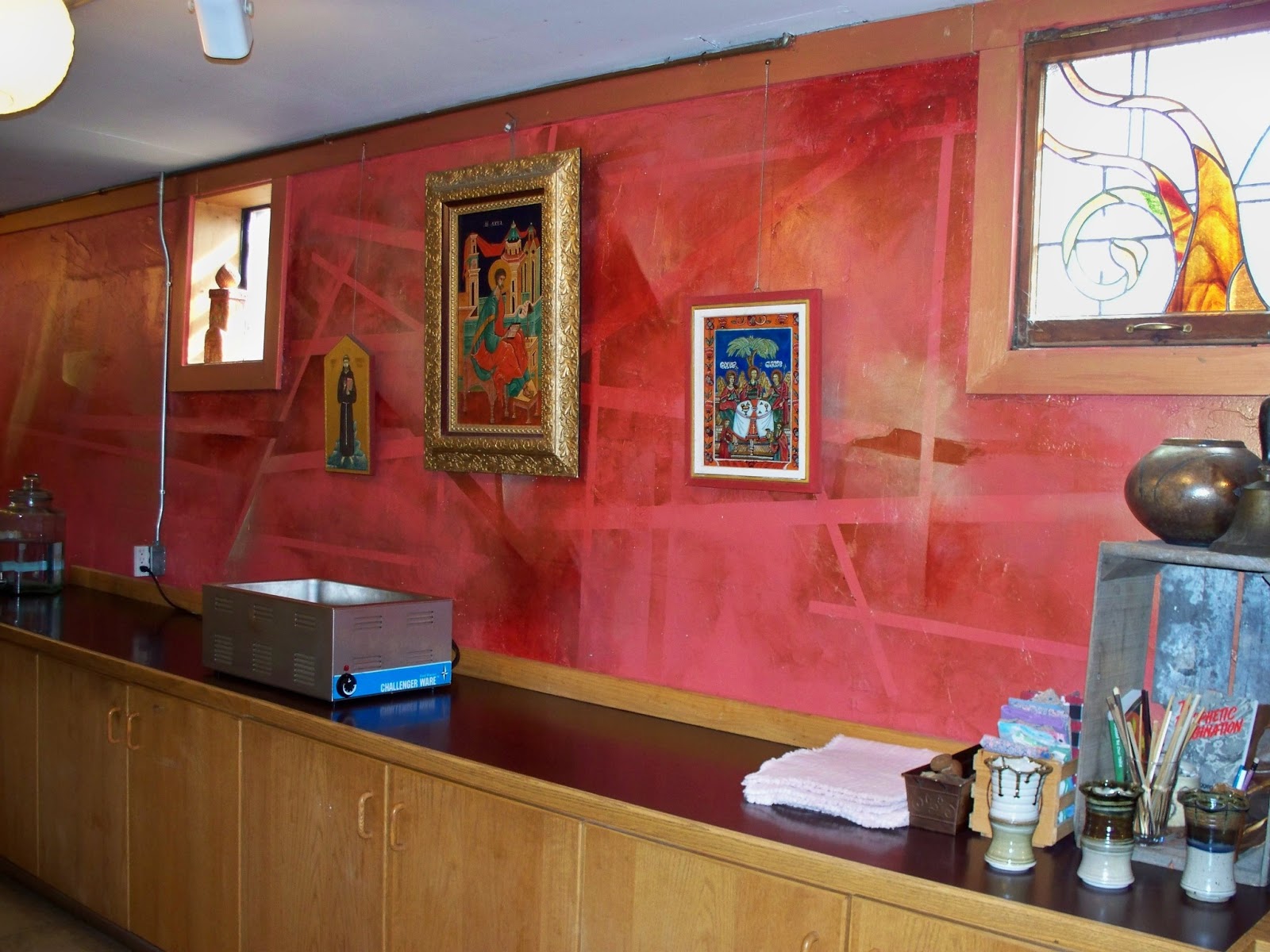 Below is the central meeting area surrounded by shelves full of art books and created things. Lofts above either side were piled with over sized cushions. The guild's core value is hospitality and is modeled after the Benedictine monastic order. For group sessions candles covered most surfaces and the wood stove burned in the evenings.